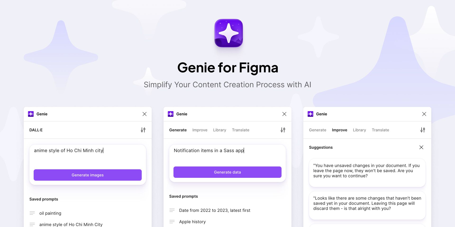 - Streamlined Content Generation: Genie is a Figma plugin designed to streamline content generation within the Figma environment.