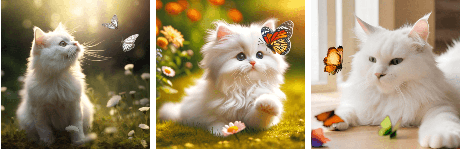 Example prompt: white hairy cute cat playing with butterfly.