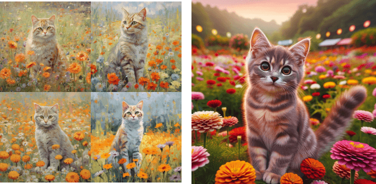 Example prompt: gray and orange tabby cat, flowers garden field, cute.