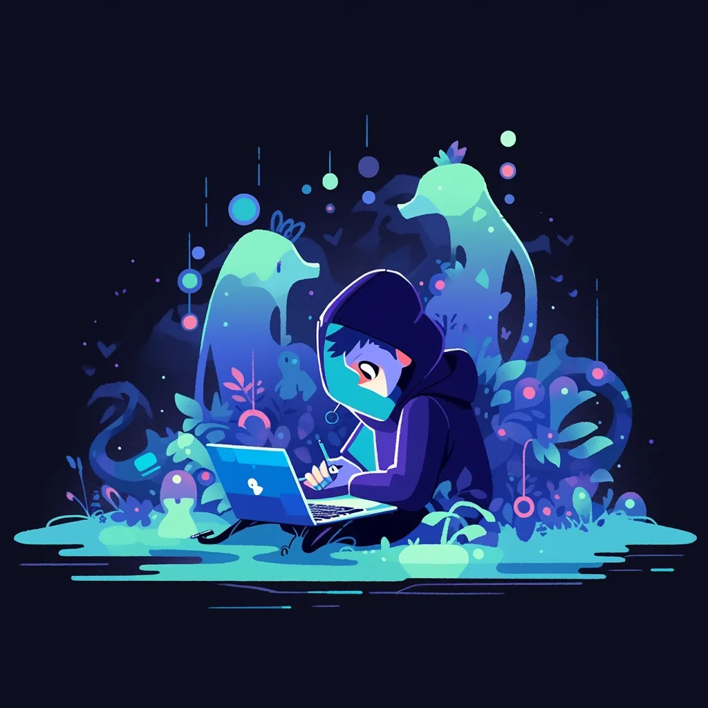 Prompt: a man using a laptop, in the style of graphic design-inspired illustrations, dark green and aquamarine, snailcore, animated illustrations, soggy, social media icons, streamlined forms, cyan, purple, simple.