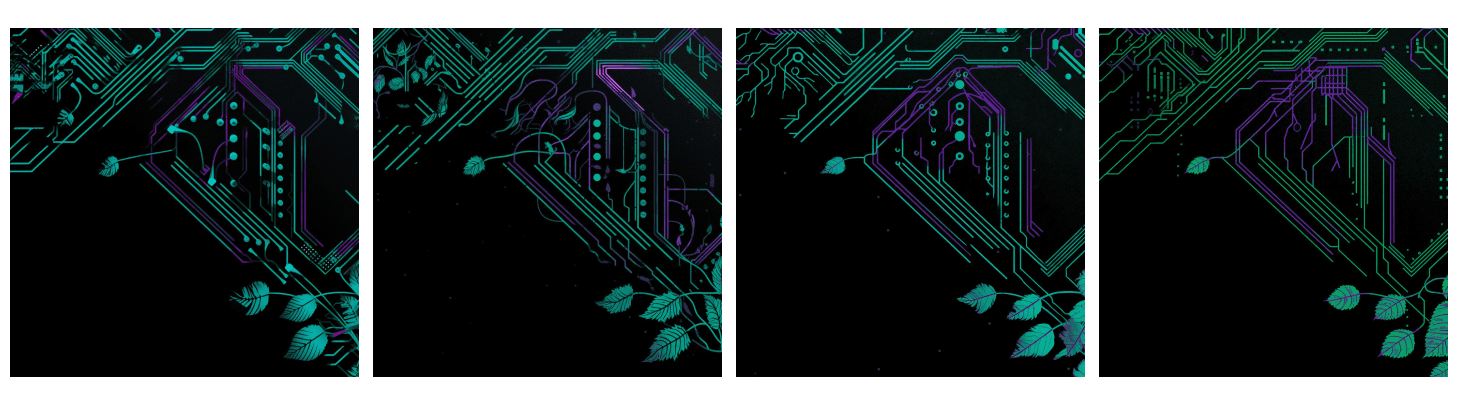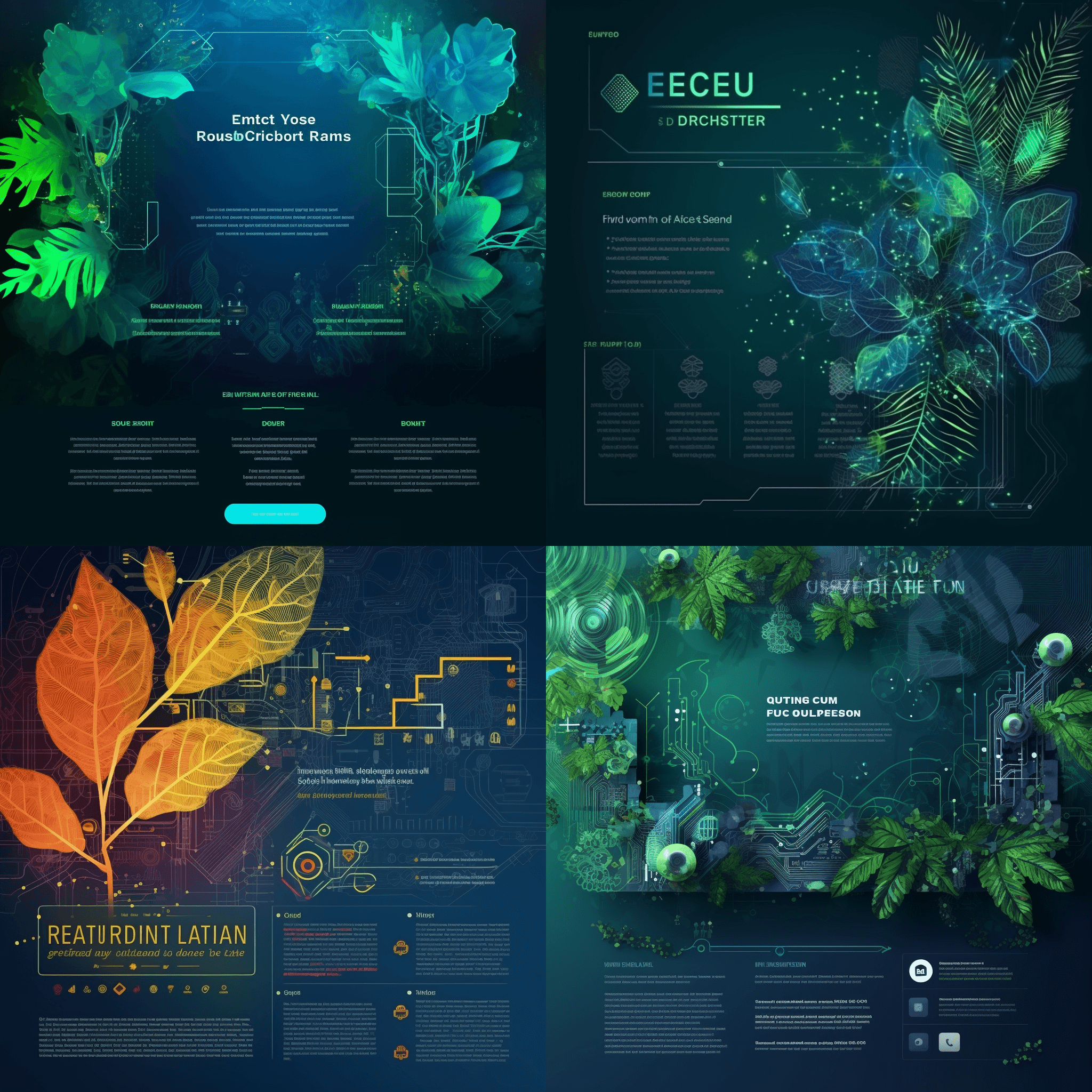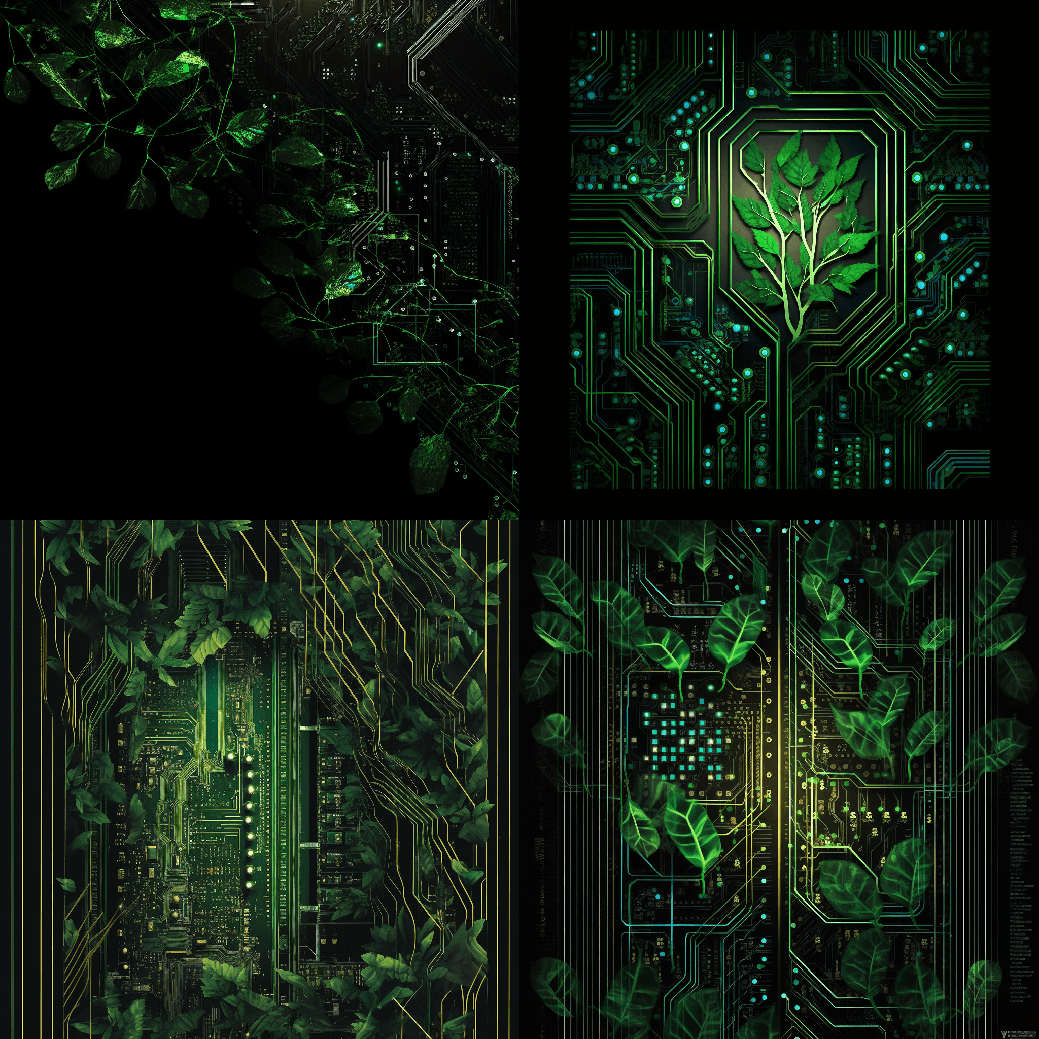 Yet, we were still grappling with how to incorporate this unique design into our webpage. We decided to modify our approach slightly and tried a new prompt: “black background, electronic circuit lines, green leaves overlaying the lines, situated on the right side of the page”. The design MidJourney returned was compelling, starting to bring our conceptual ideas to life in a visually striking way. Here's what MidJourney produced: