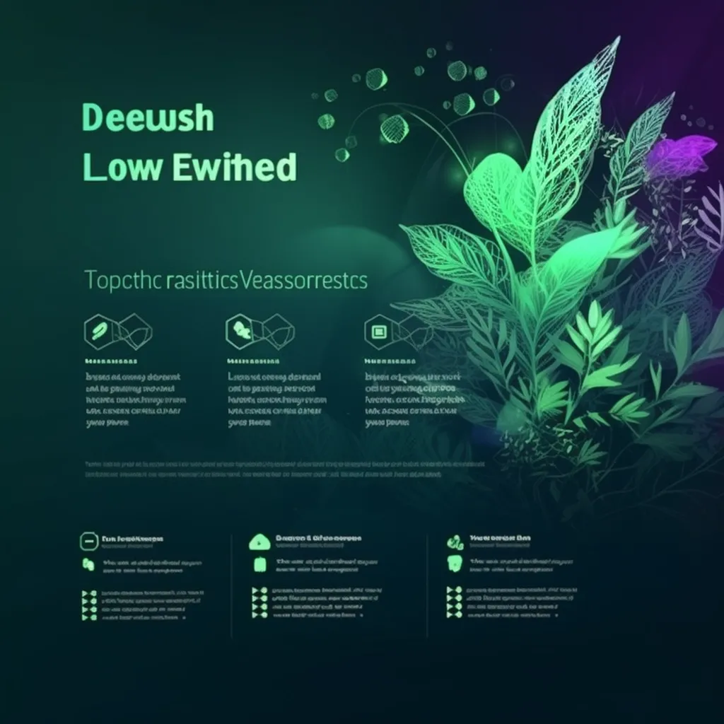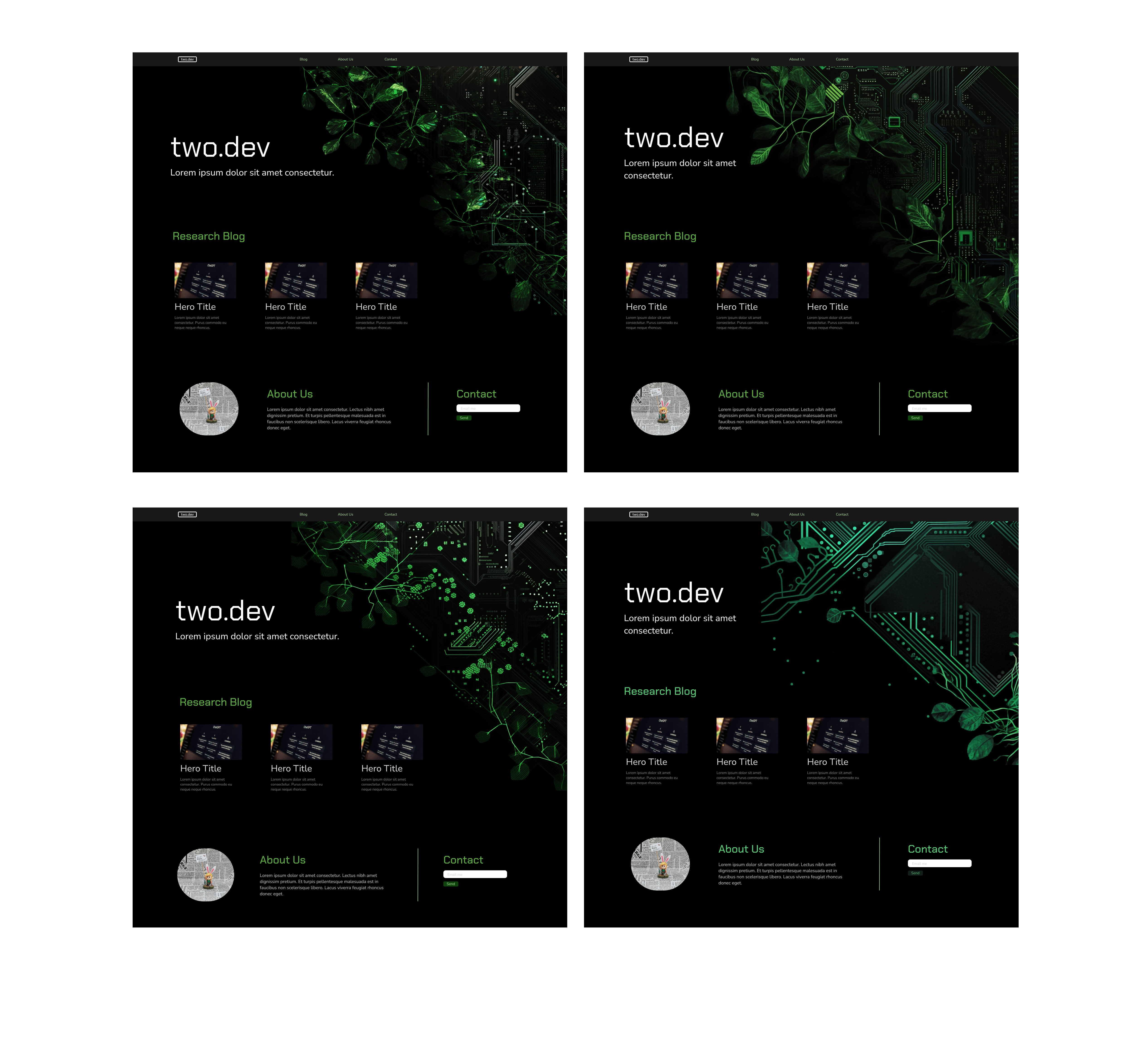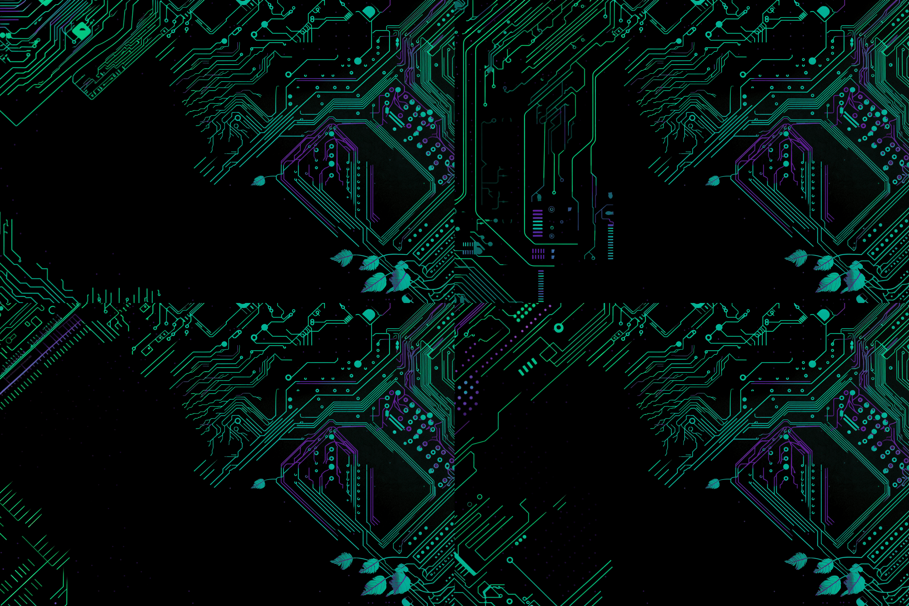 Yet, we were still grappling with how to incorporate this unique design into our webpage. We decided to modify our approach slightly and tried a new prompt: “black background, electronic circuit lines, green leaves overlaying the lines, situated on the right side of the page”. The design MidJourney returned was compelling, starting to bring our conceptual ideas to life in a visually striking way. Here's what MidJourney produced: