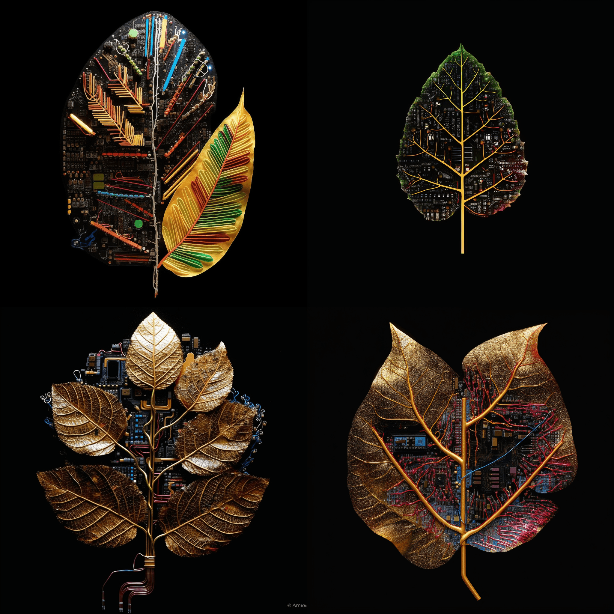 Keeping this webpage structure in mind, we fleshed out our design scheme in Figma. Yet, we wanted to add more intricate details through Midjourney. However, we sought to add a unique touch with MidJourney, imagining leaves intertwined with electronic circuits. We prompted MidJourney with a specific vision: “leaves with electronic circuits as ramifications, drawn with the ramifications extending beyond the leaf, set against a black background”. The resulting design is as follows: